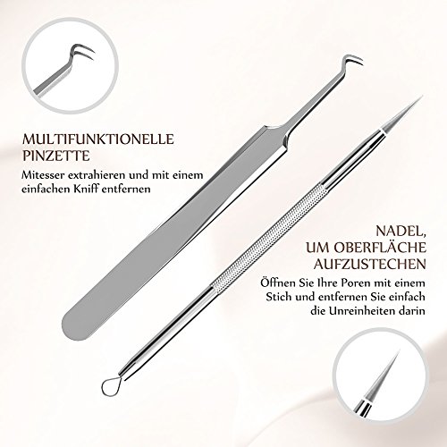 Professionell, sicher und zuverlässig: 6 verschieden geformte Ösen, Nadel und Pinzette werden Ihren Pickeln und anderen Unreinheiten effektiv entfernen.
